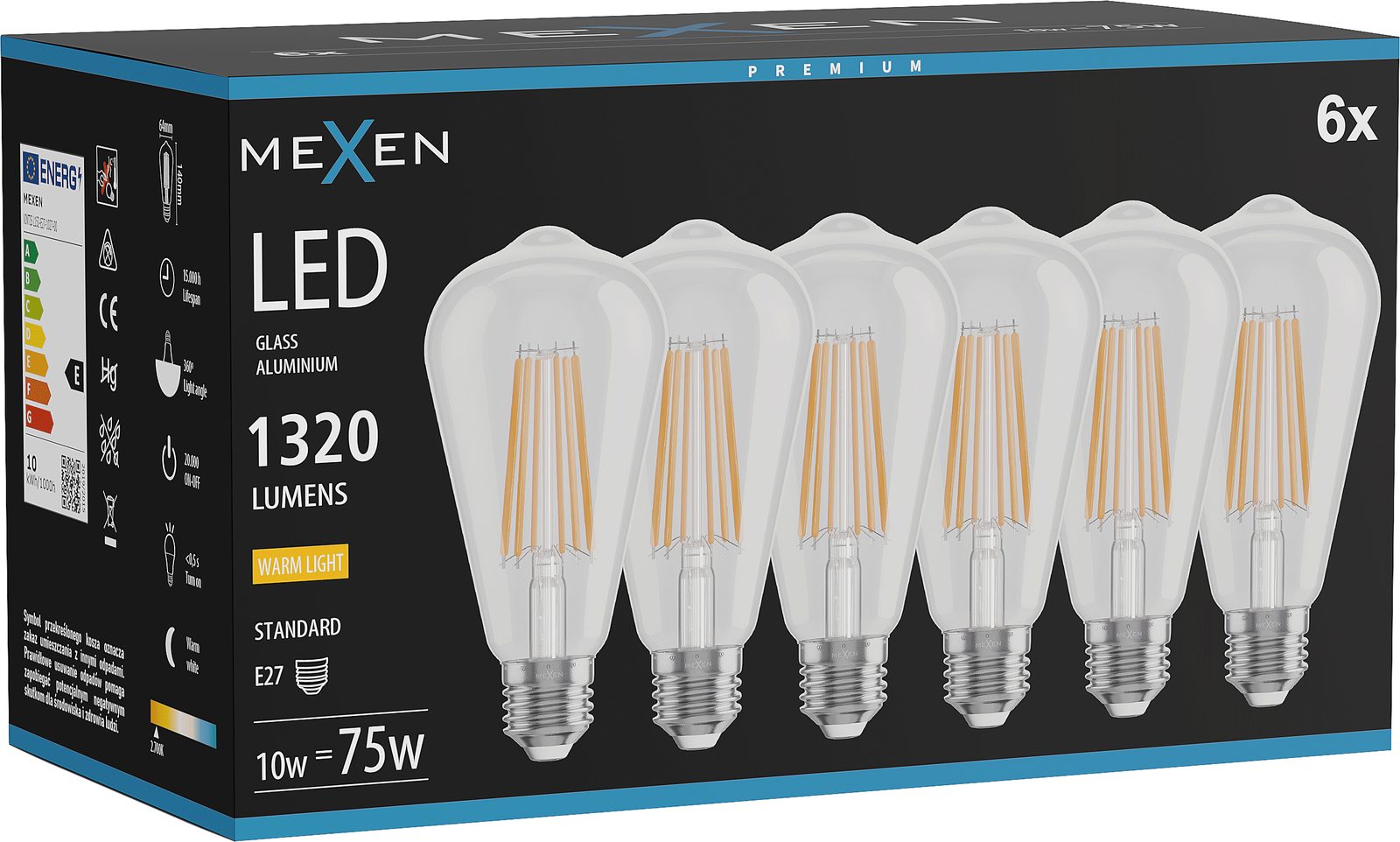 Mexen Vintis 6x LED Filament Bulb E27, ST64, 10W, Warm - 2700K, 1320 lm, clear - L152-E27-1027-00x06