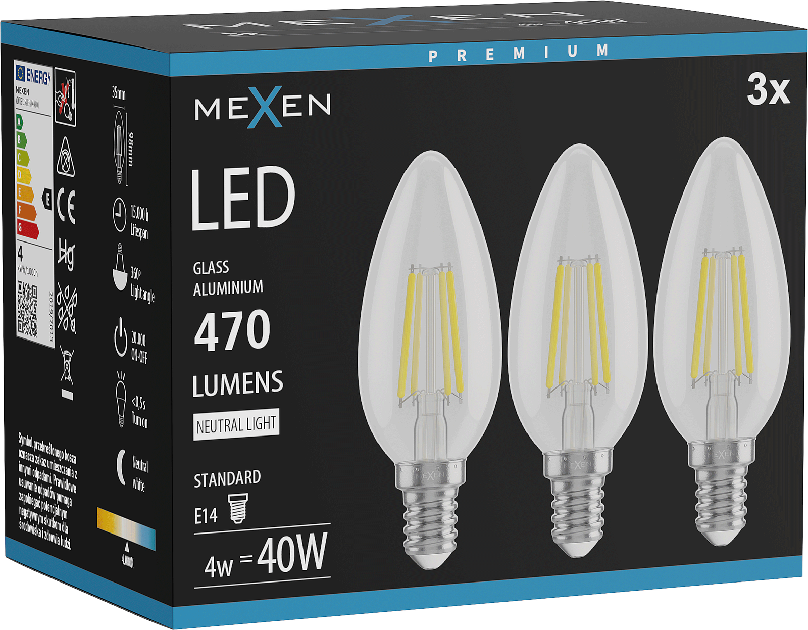 Mexen Vintis 3x LED Filament Bulb E14, C35, 4W, Neutral - 4000K, 470 lm, clear - L154-E14-0427-00x03 - L154-E14-0440-00x03