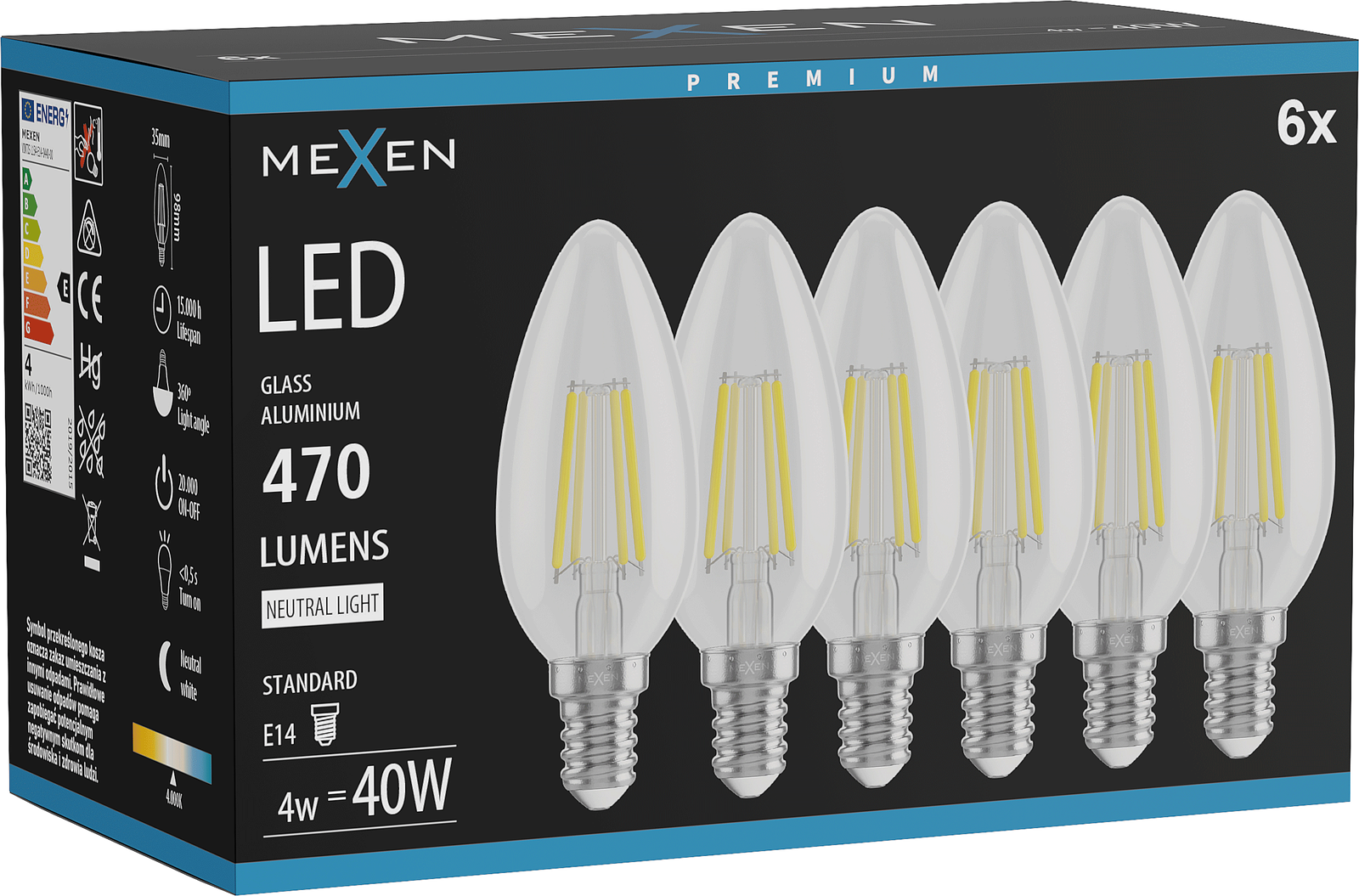 Mexen Vintis 6x LED Filament Bulb E14, C35, 4W, Neutral - 4000K, 470 lm, clear - L154-E14-0427-00x06 - L154-E14-0440-00x06