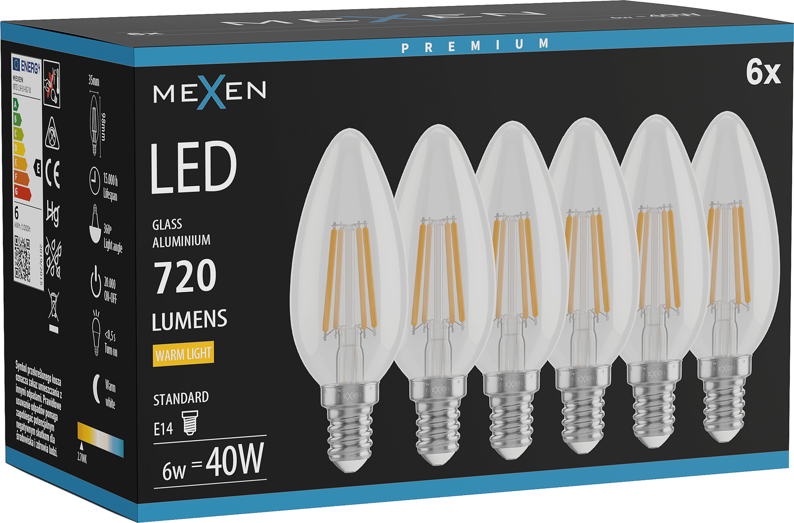 Mexen Vintis 6x Filament LED Bulb E14, C35, 6W, Warm - 2700K, 720 lm, clear - L154-E14-0627-00x06