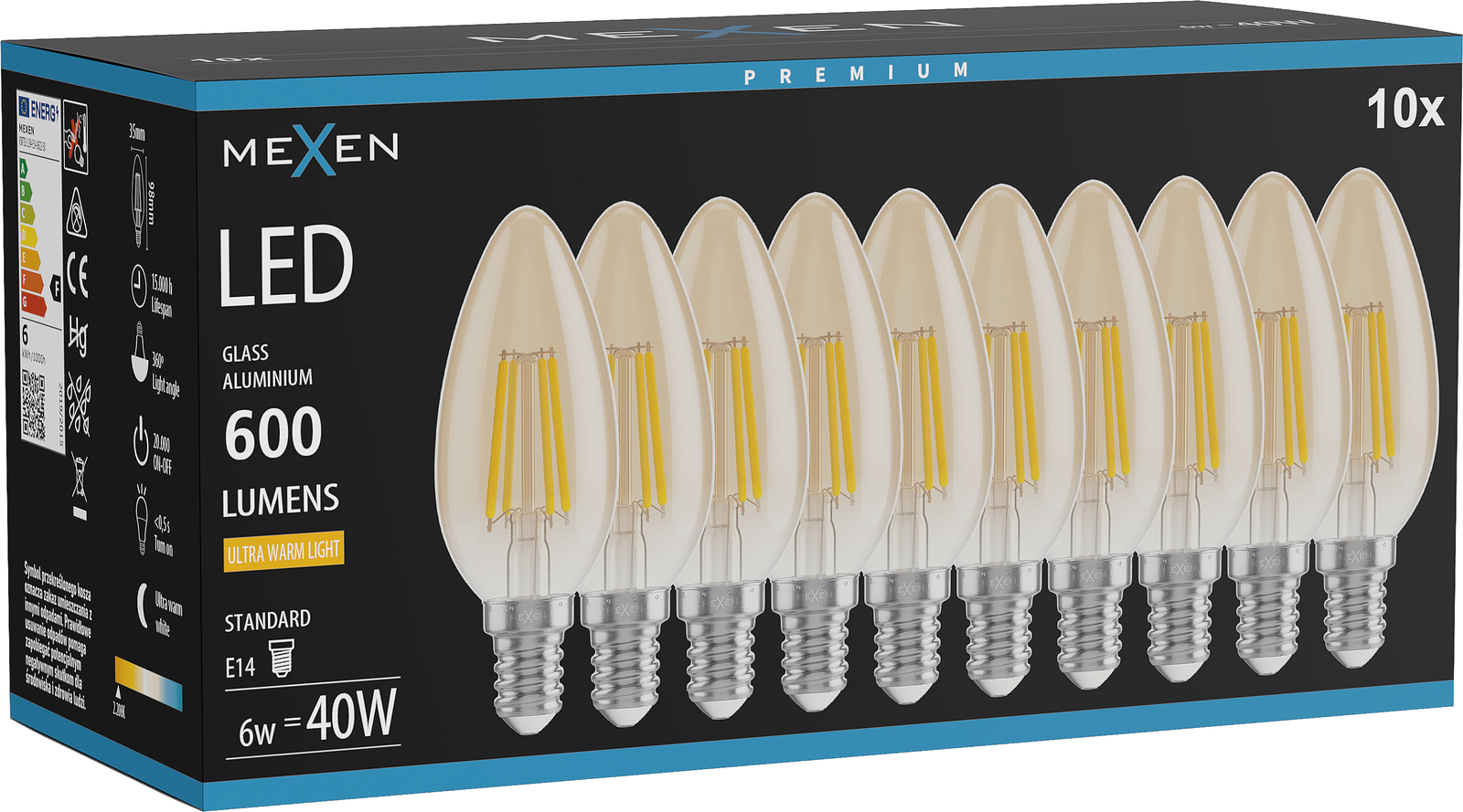 Mexen Vintis 10x Filament LED Bulb E14, C35, 6W, Warm - 2200K, 600 lm, amber - L154-E14-0622-50x10