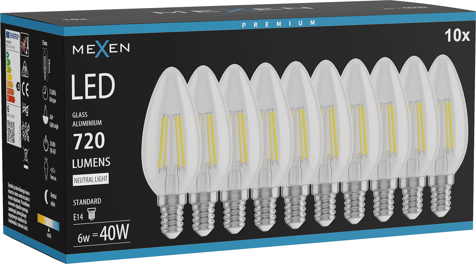 Mexen Vintis 10x LED Filament Bulb E14, C35, 6W, Neutral - 4000K, 720 lm, clear - L154-E14-0640-00x10