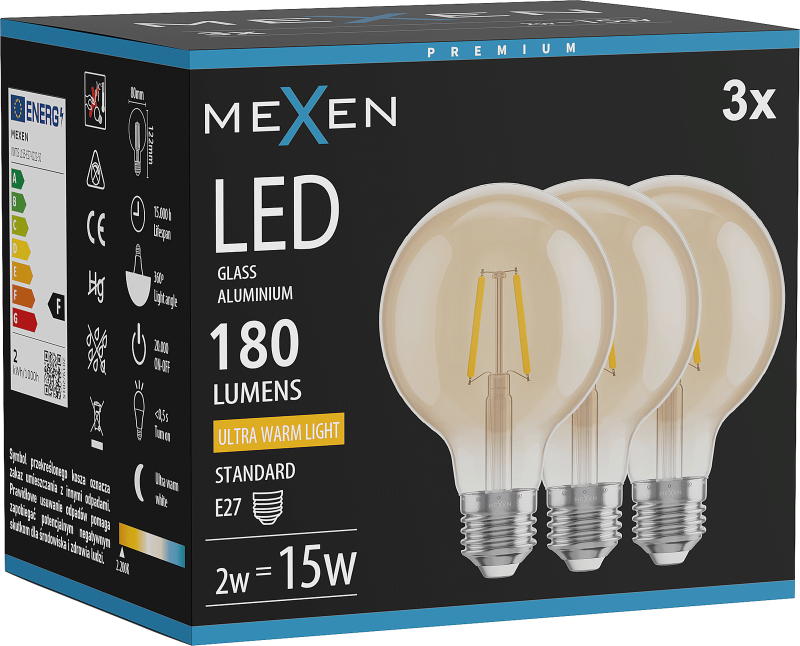 Mexen Vintis 3x LED filament bulb E27, G80, 2W, Warm - 2200K, 180 lm, amber - L155-E27-0222-50x03
