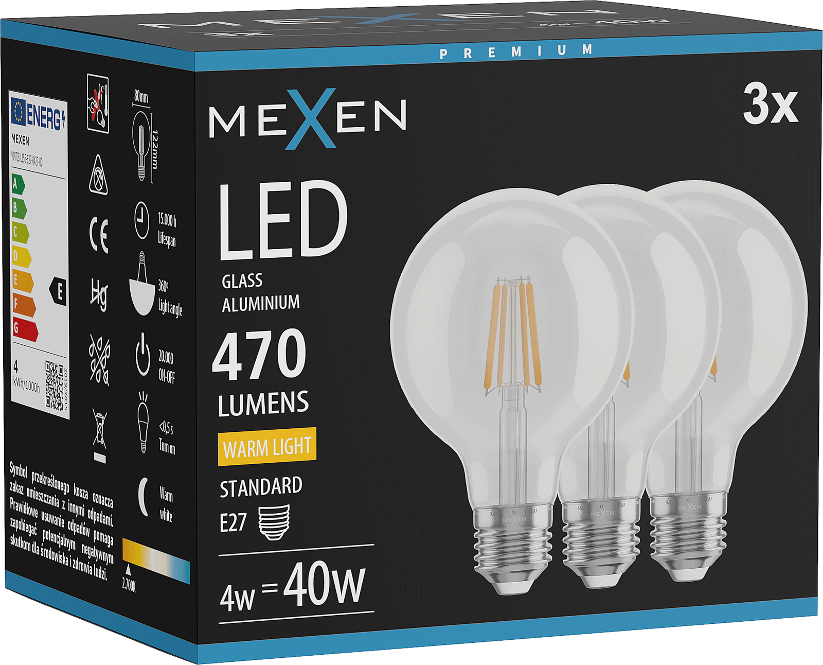 Mexen Vintis 3x LED filament bulb E27, G80, 4W, Warm - 2700K, 470 lm, clear - L155-E27-0427-00x03