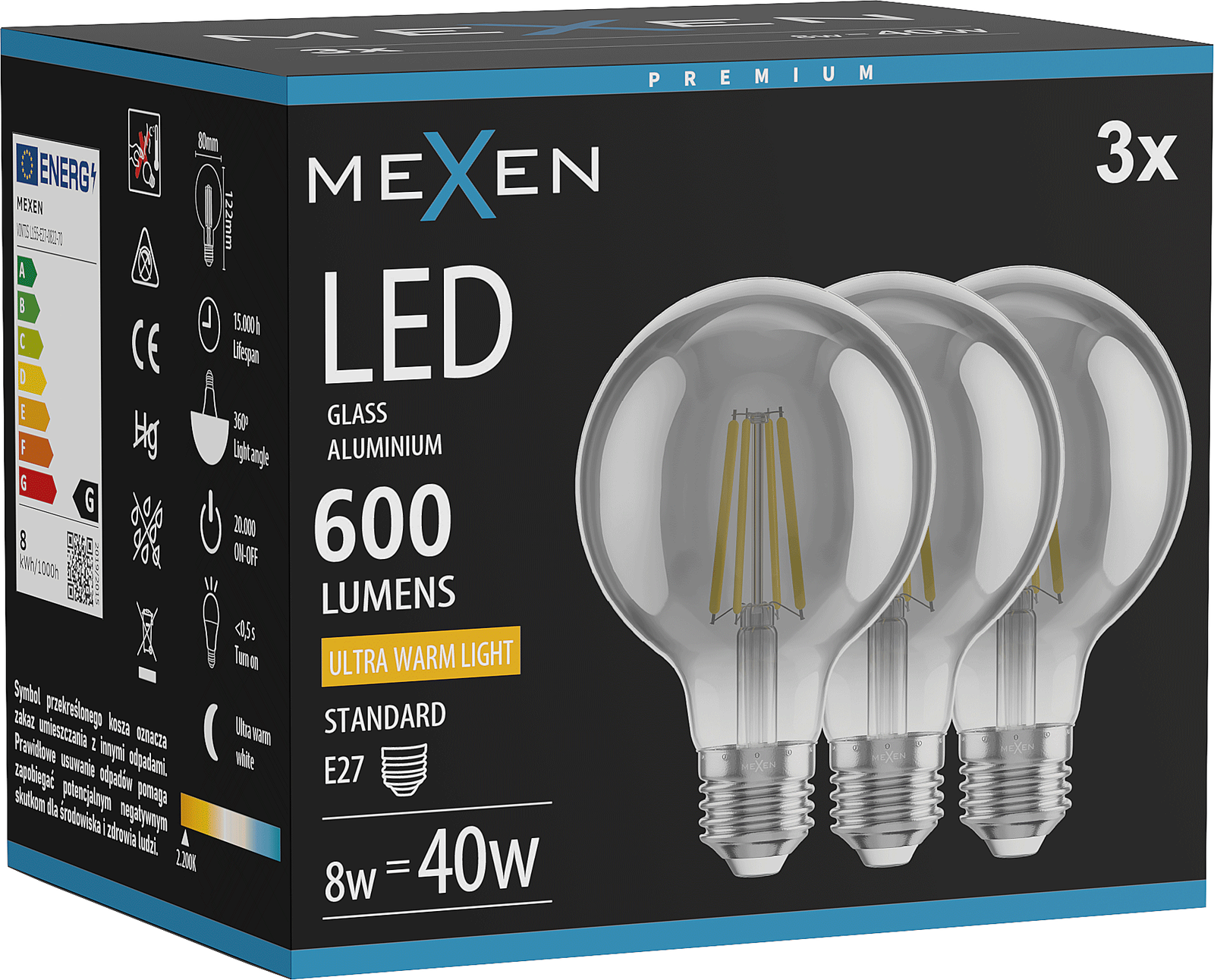 Mexen Vintis 3x LED Filament Bulb E27, G80, 8W, Warm - 2200K, 600 lm, smoke - L155-E27-0822-70x03