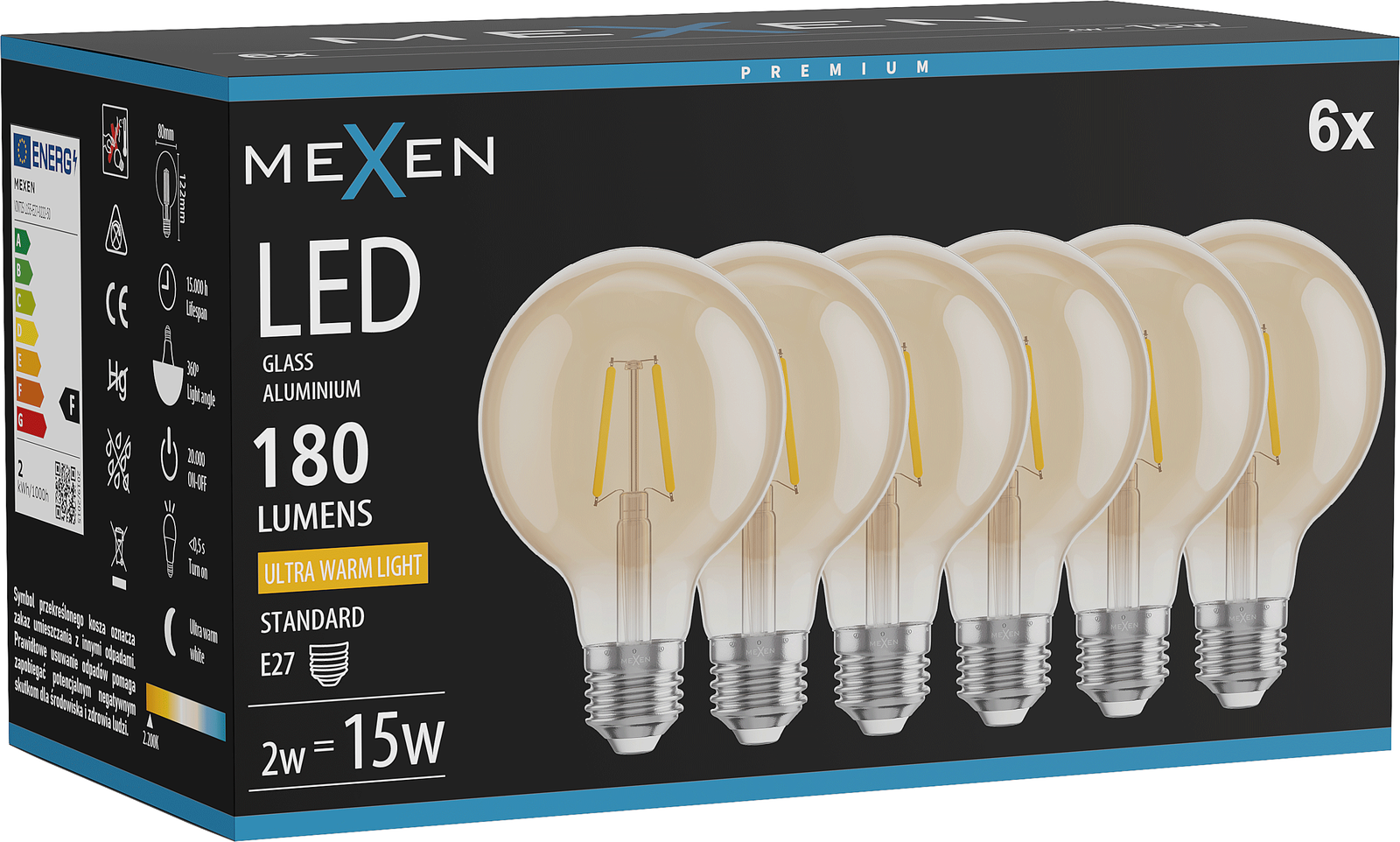 Mexen Vintis 6x LED Filament Bulb E27, G80, 2W, Warm - 2200K, 180 lm, amber - L155-E27-0222-50x06