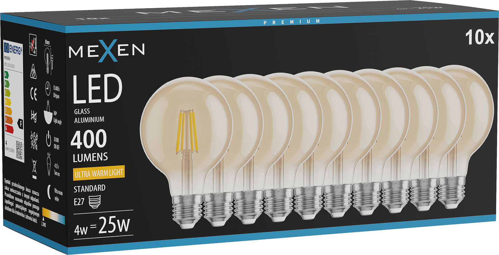 Mexen Vintis 10x LED Filament Bulb E27, G80, 4W, Warm - 2200K, 400 lm, amber - L155-E27-0422-50x10