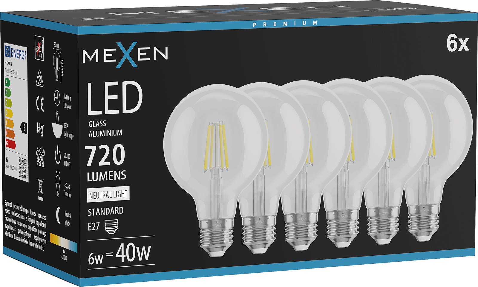 Mexen Vintis 6x LED Filament Bulb E27, G80, 6W, Neutral - 4000K, 720 lm, clear - L155-E27-0640-00x06