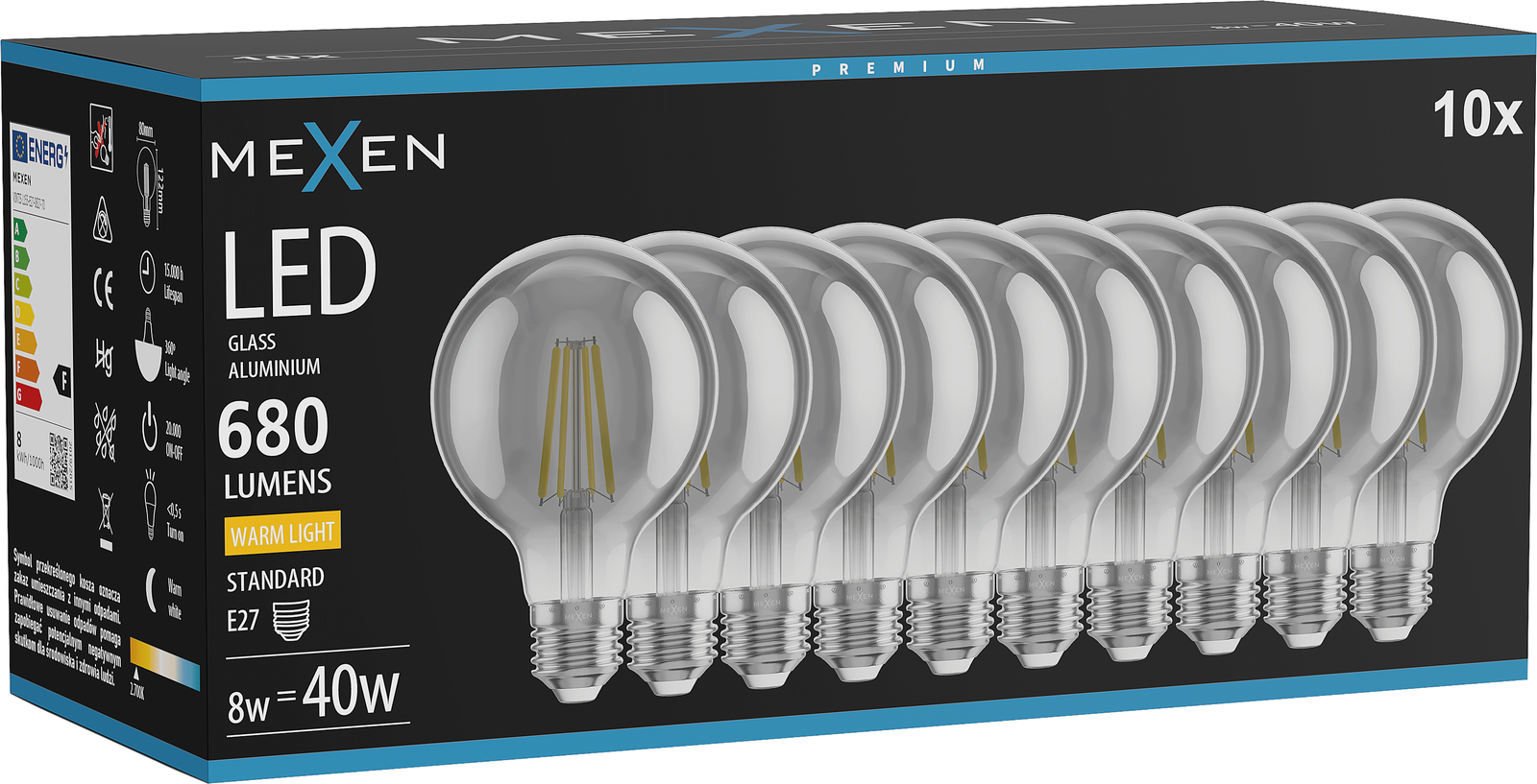 Mexen Vintis 10x LED filament bulb E27, G80, 8W, Warm - 2700K, 680 lm, smoke - L155-E27-0827-70x10