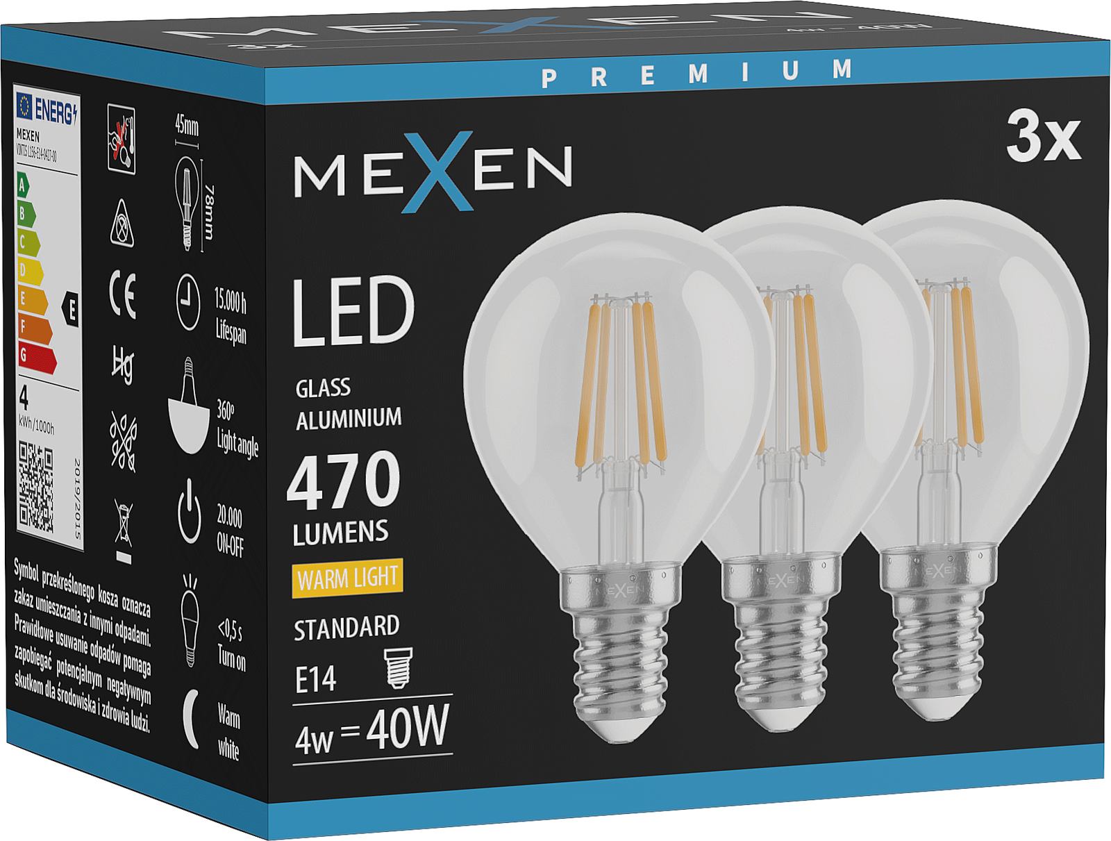Mexen Vintis 3x LED Filament Bulb E14, G45, 4W, Warm - 2700K, 470 lm, clear - L156-E14-0427-00x03