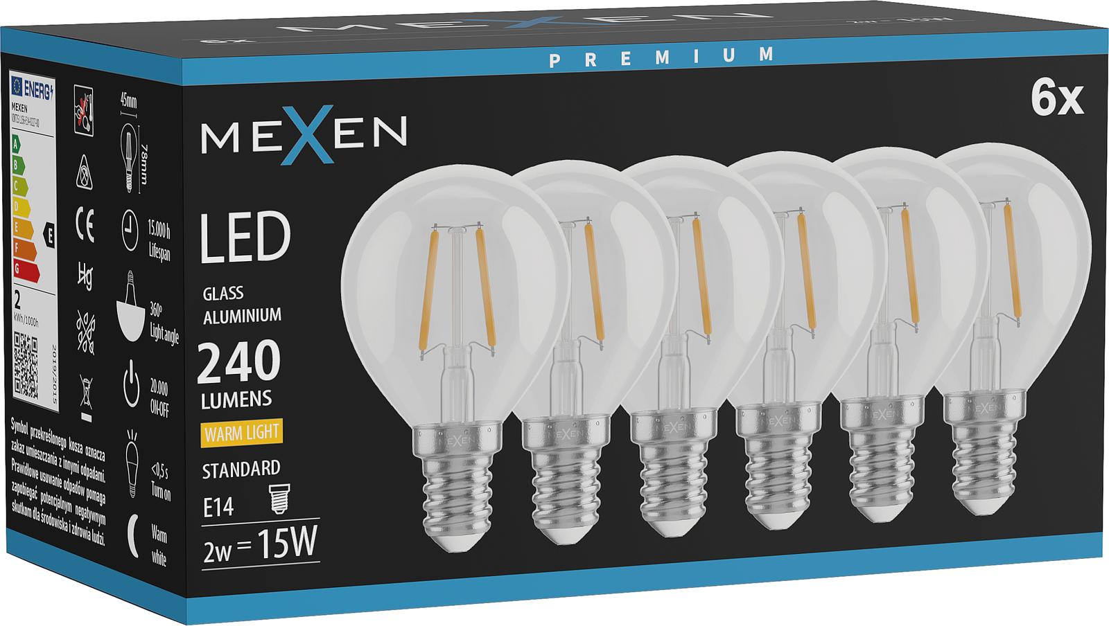 Mexen Vintis 6x LED Filament Bulb E14, G45, 2W, Warm - 2700K, 240 lm, clear - L156-E14-0227-00x06