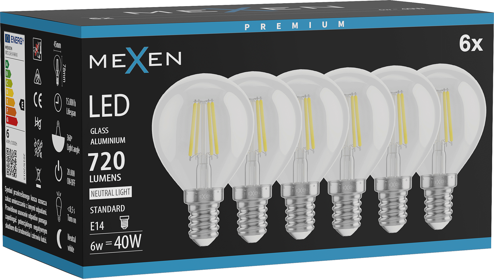 Mexen Vintis 6x LED Filament Bulb E14, G45, 6W, Neutral - 4000K, 720 lm, clear - L156-E14-0640-00x06