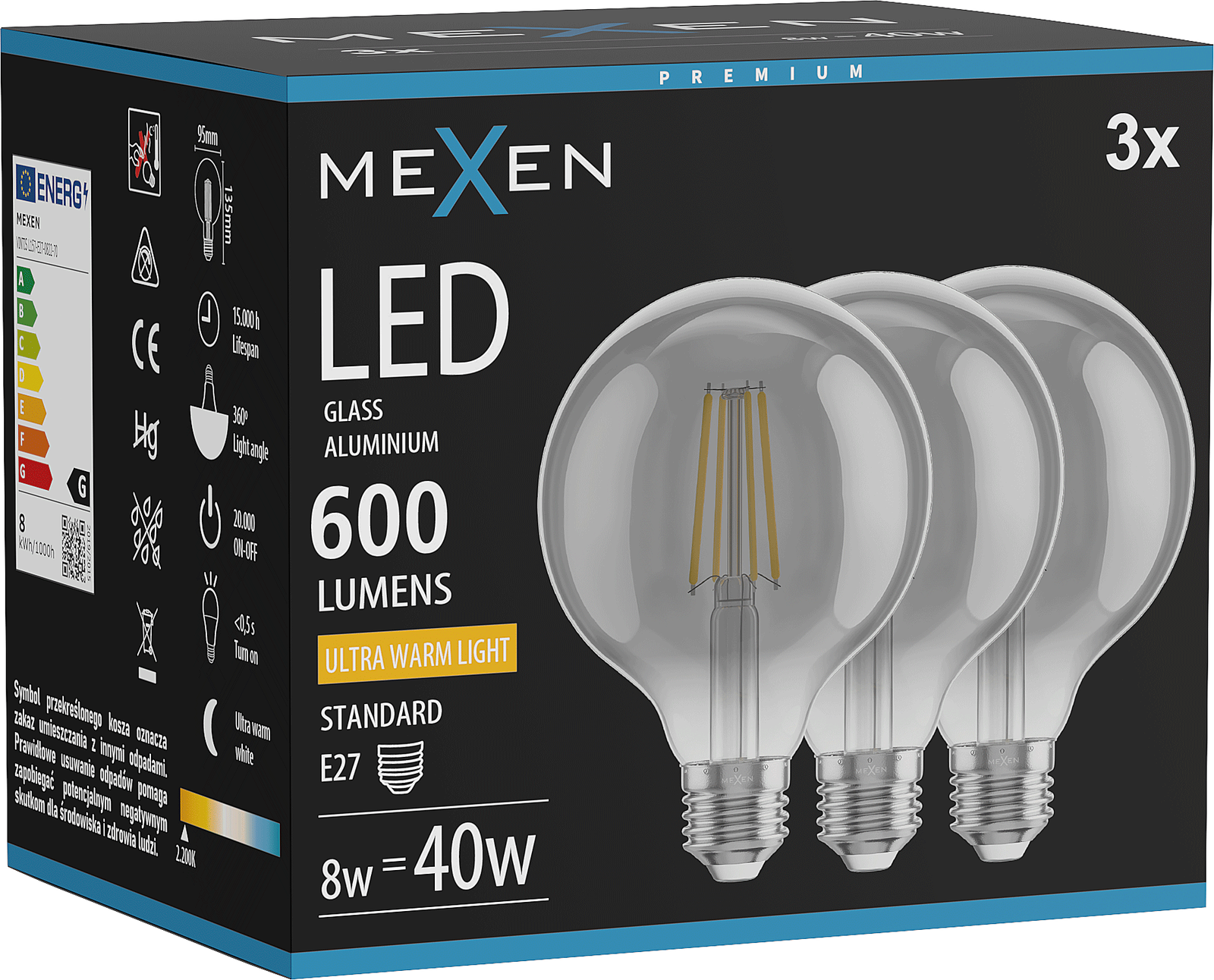 Mexen Vintis 3x Filament LED Bulb E27, G95, 8W, Warm - 2200K, 600 lm, Smoke - L157-E27-0822-70x03