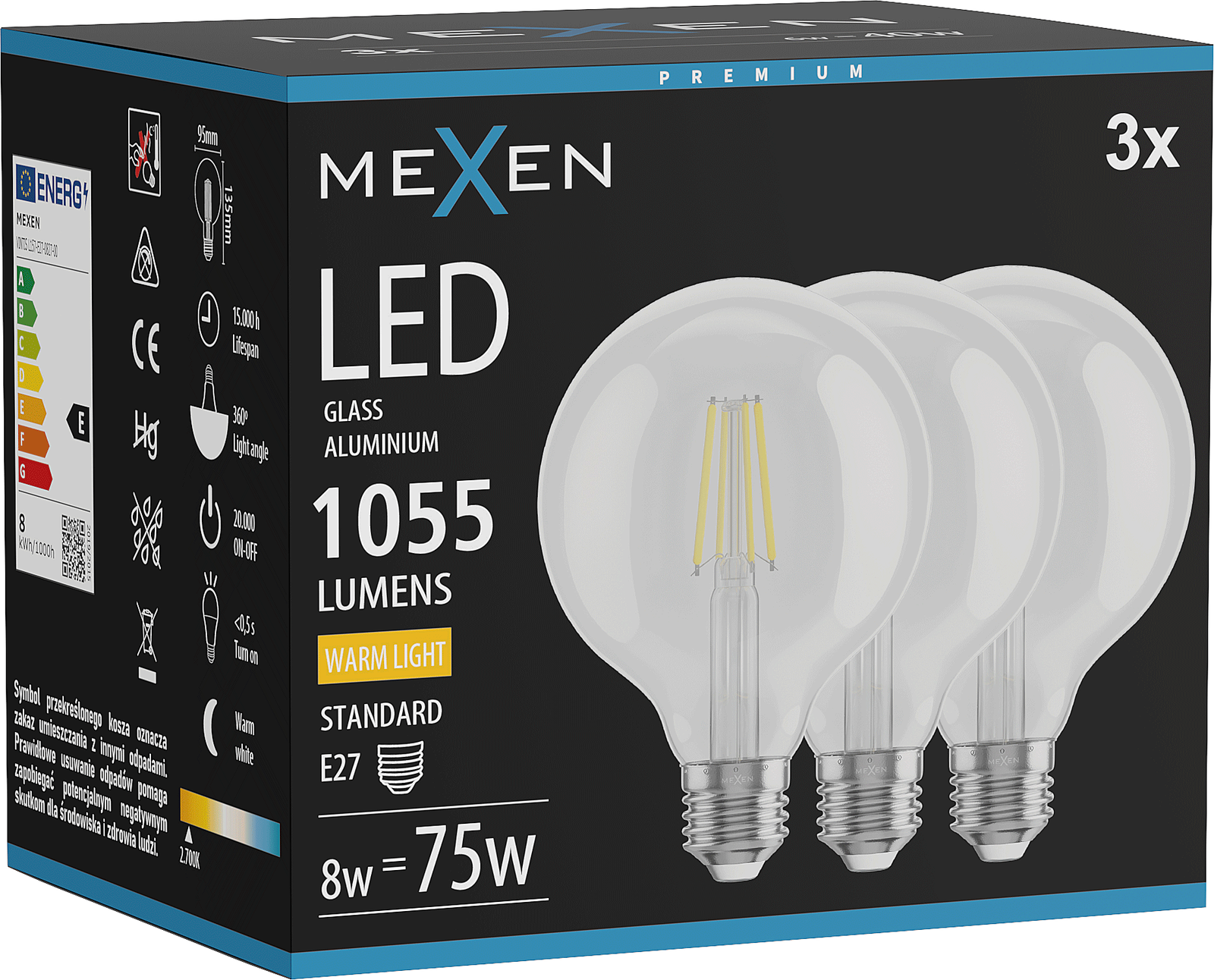 Mexen Vintis 3x LED Filament Bulb E27, G95, 8W, Warm - 2700K, 1055 lm, clear - L157-E27-0827-00x03