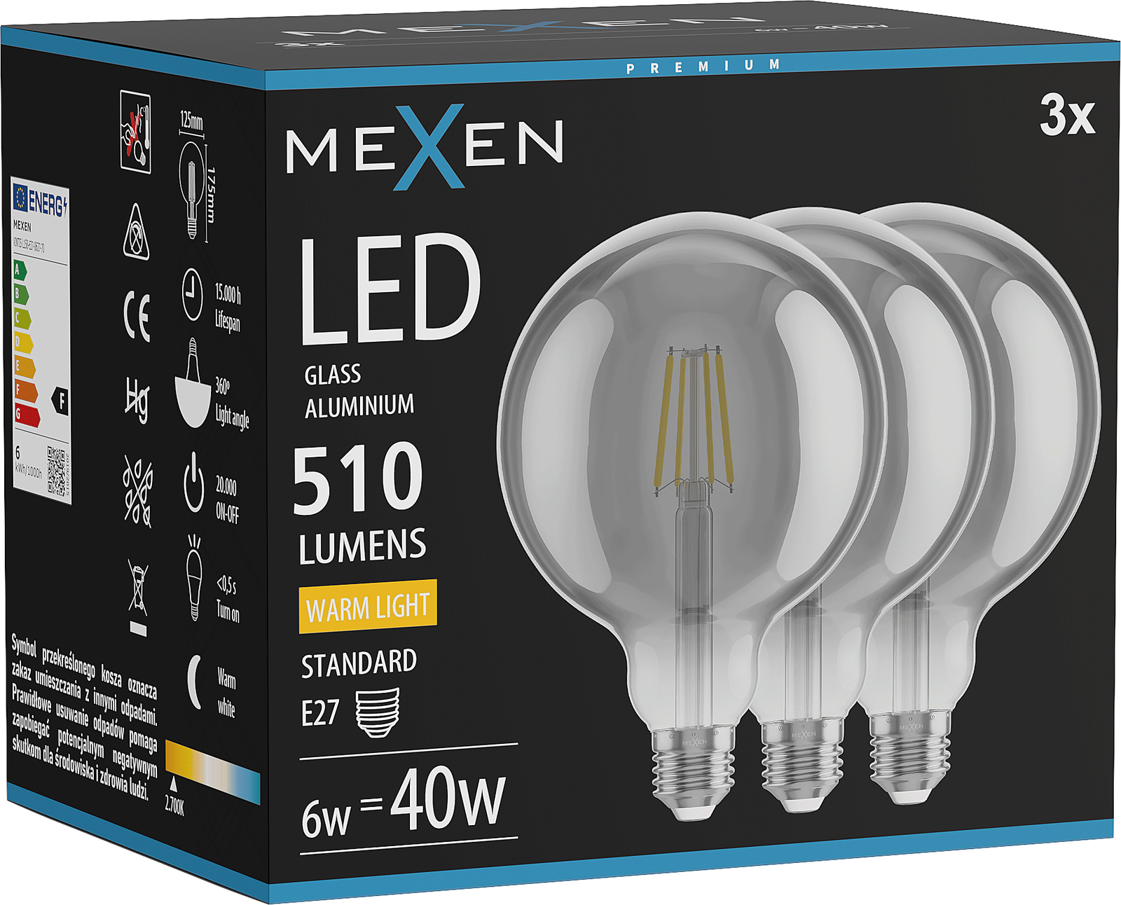 Mexen Vintis 3x LED Filament Bulb E27, G125, 6W, Warm - 2700K, 510 lm, smoke - L158-E27-0627-70x03