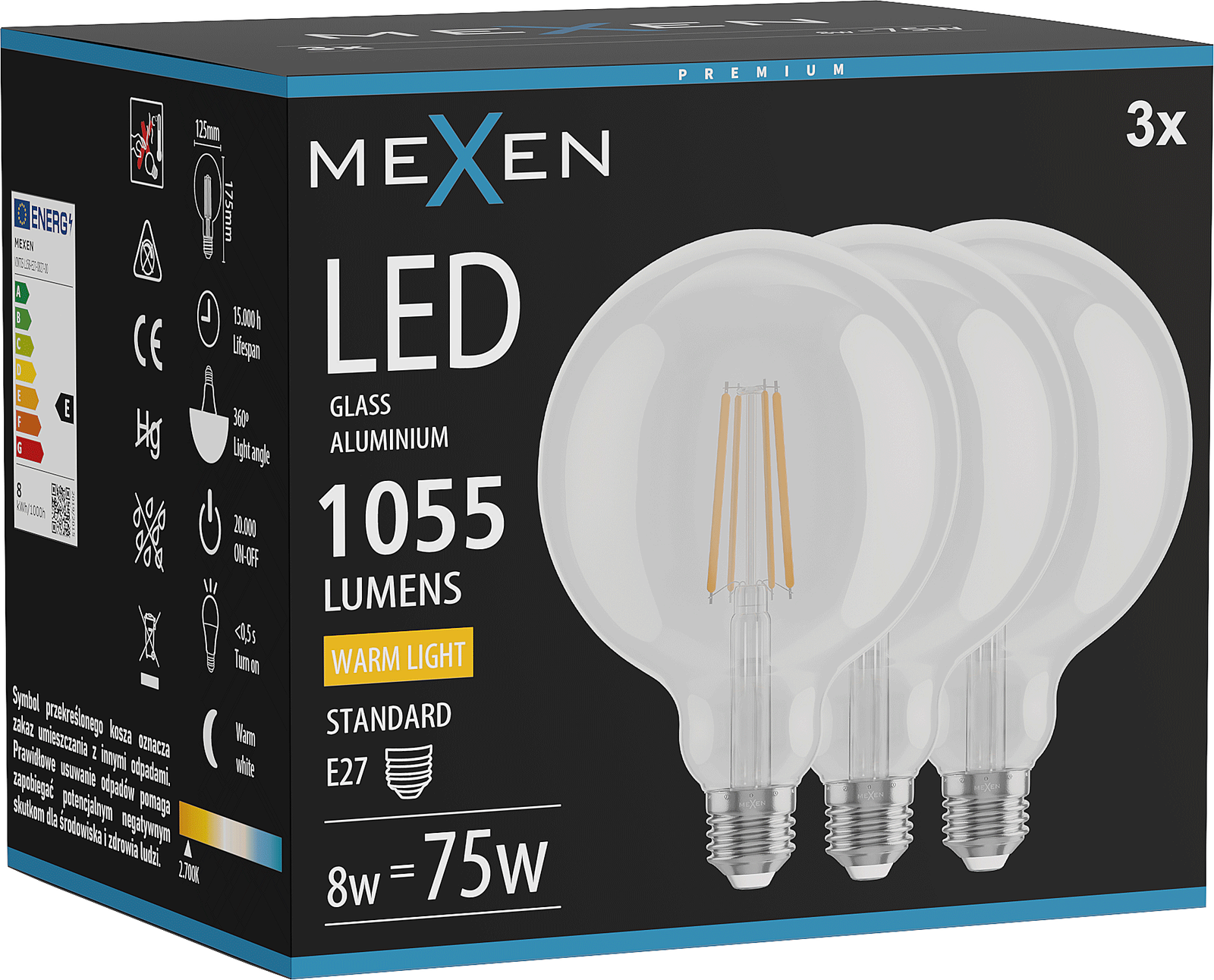 Mexen Vintis 3x LED Filament Bulb E27, G125, 8W, Warm - 2700K, 1055 lm, clear - L158-E27-0827-00x03