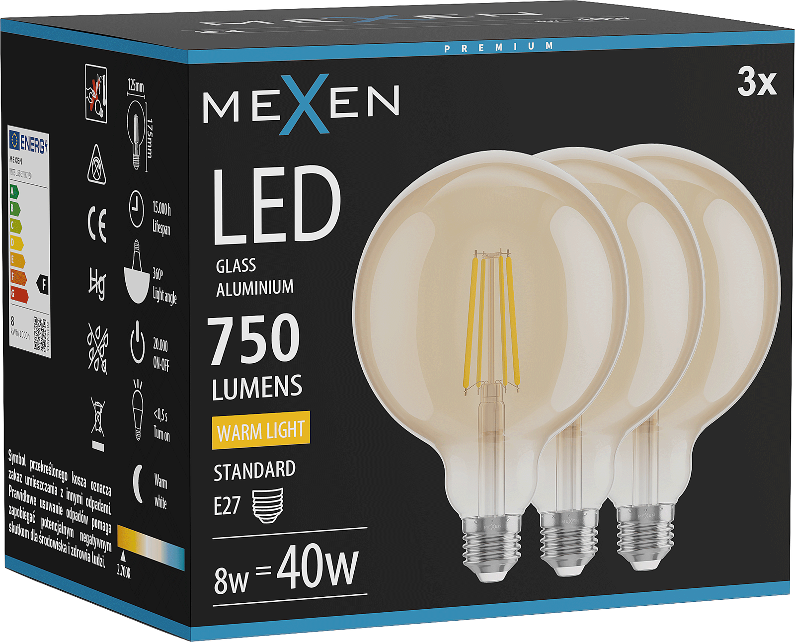 Mexen Vintis 3x LED Filament Bulb E27, G125, 8W, Warm - 2700K, 750 lm, amber - L158-E27-0827-50x03