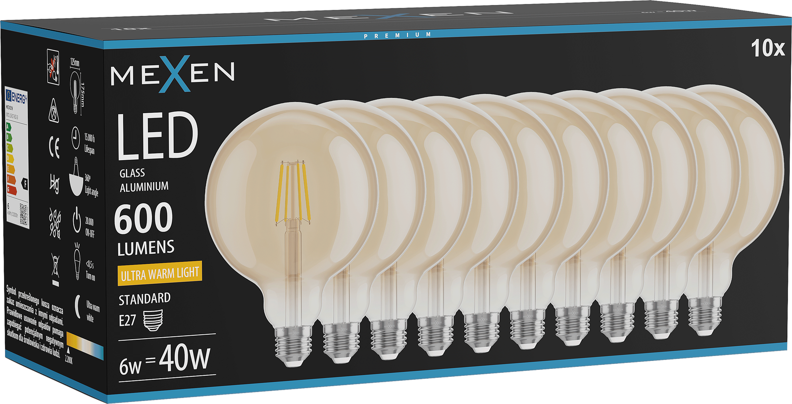 Mexen Vintis 10x LED Filament Bulb E27, G125, 6W, Warm - 2200K, 600 lm, amber - L158-E27-0622-50x10