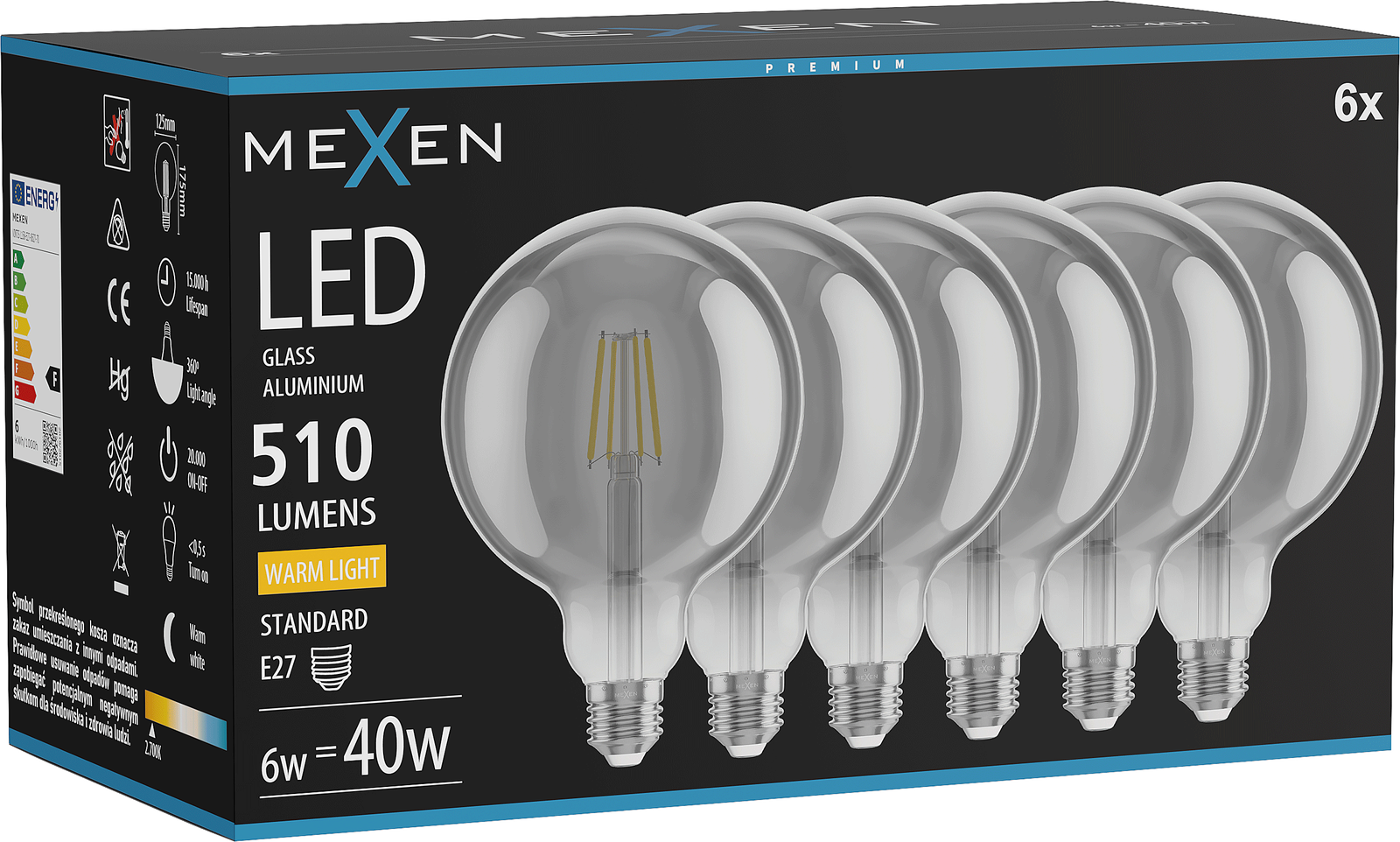 Mexen Vintis 6x LED filament bulb E27, G125, 6W, Warm - 2700K, 510 lm, smoke - L158-E27-0627-70x06