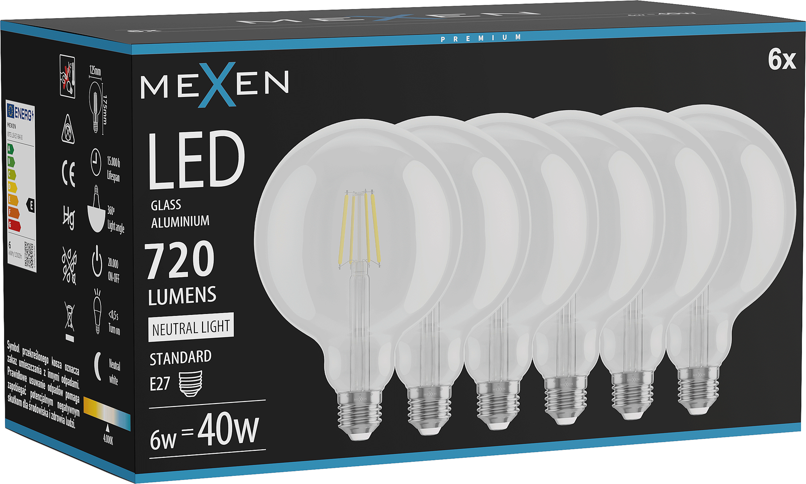 Mexen Vintis 6x LED Filament Bulb E27, G125, 6W, Neutral - 4000K, 720 lm, clear - L158-E27-0640-00x06