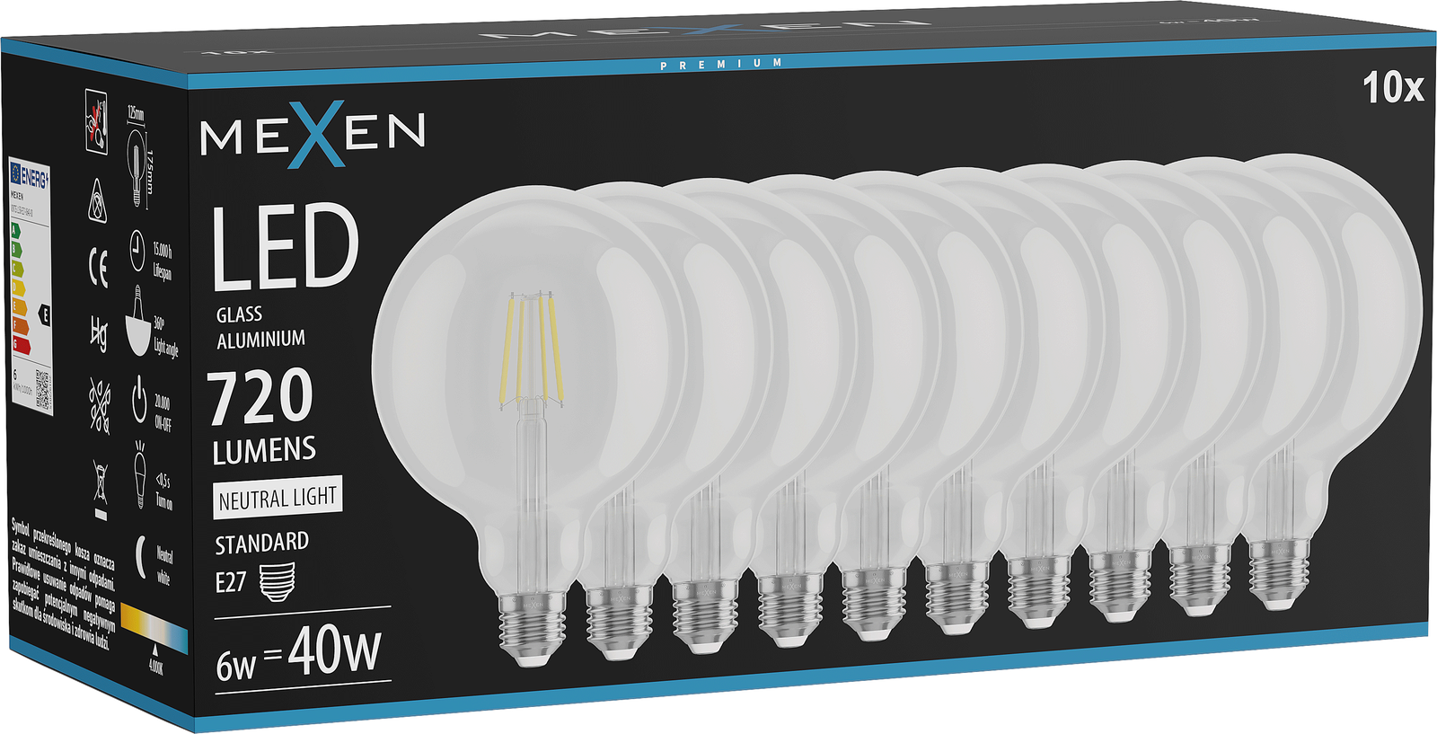 Mexen Vintis 10x LED Filament Bulb E27, G125, 6W, Neutral - 4000K, 720 lm, clear - L158-E27-0640-00x10