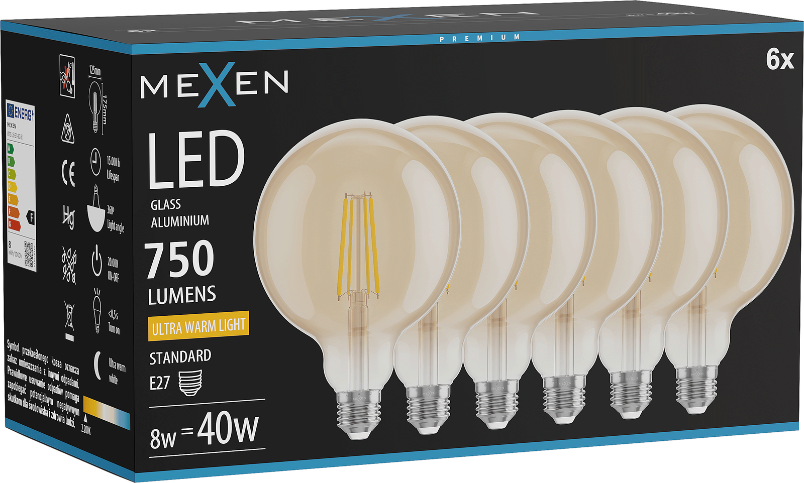 Mexen Vintis 6x LED filament bulb E27, G125, 8W, Warm - 2200K, 750 lm, amber - L158-E27-0822-50x06