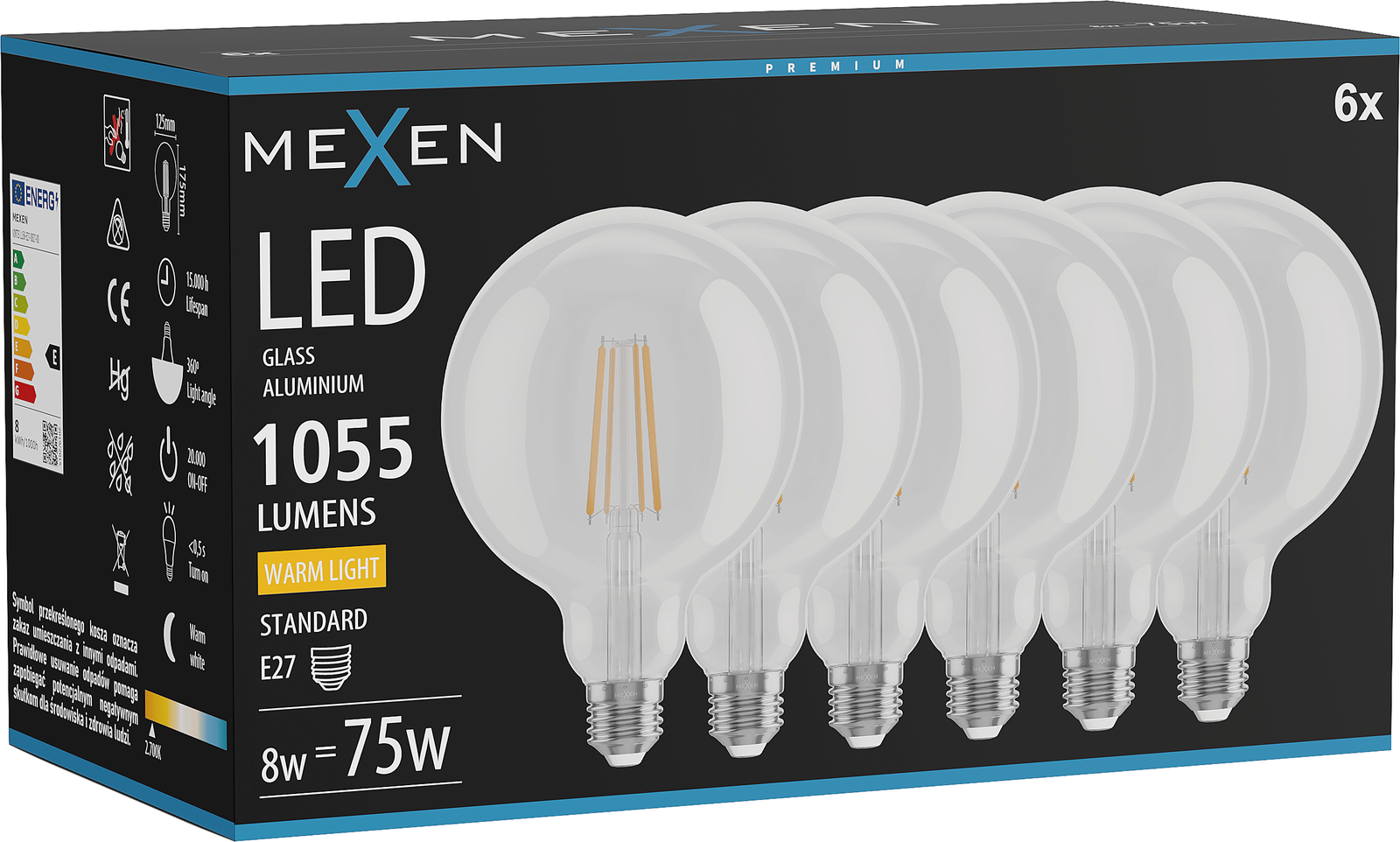 Mexen Vintis 6x LED Filament Bulb E27, G125, 8W, Warm - 2700K, 1055 lm, Clear - L158-E27-0827-00x06