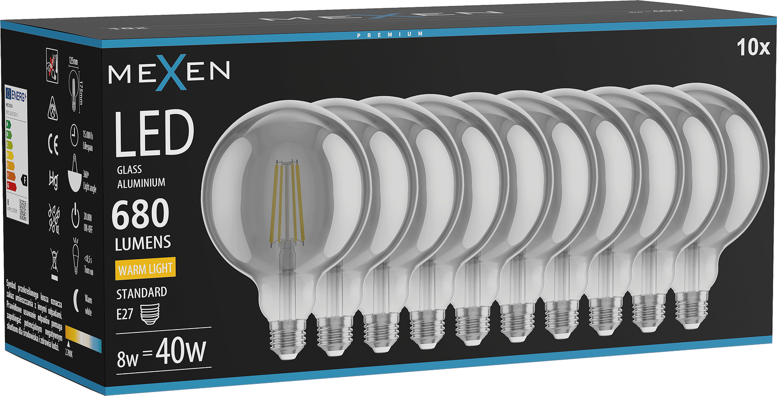 Mexen Vintis 10x LED Filament Bulb E27, G125, 8W, Warm - 2700K, 680 lm, smoke - L158-E27-0827-70x10