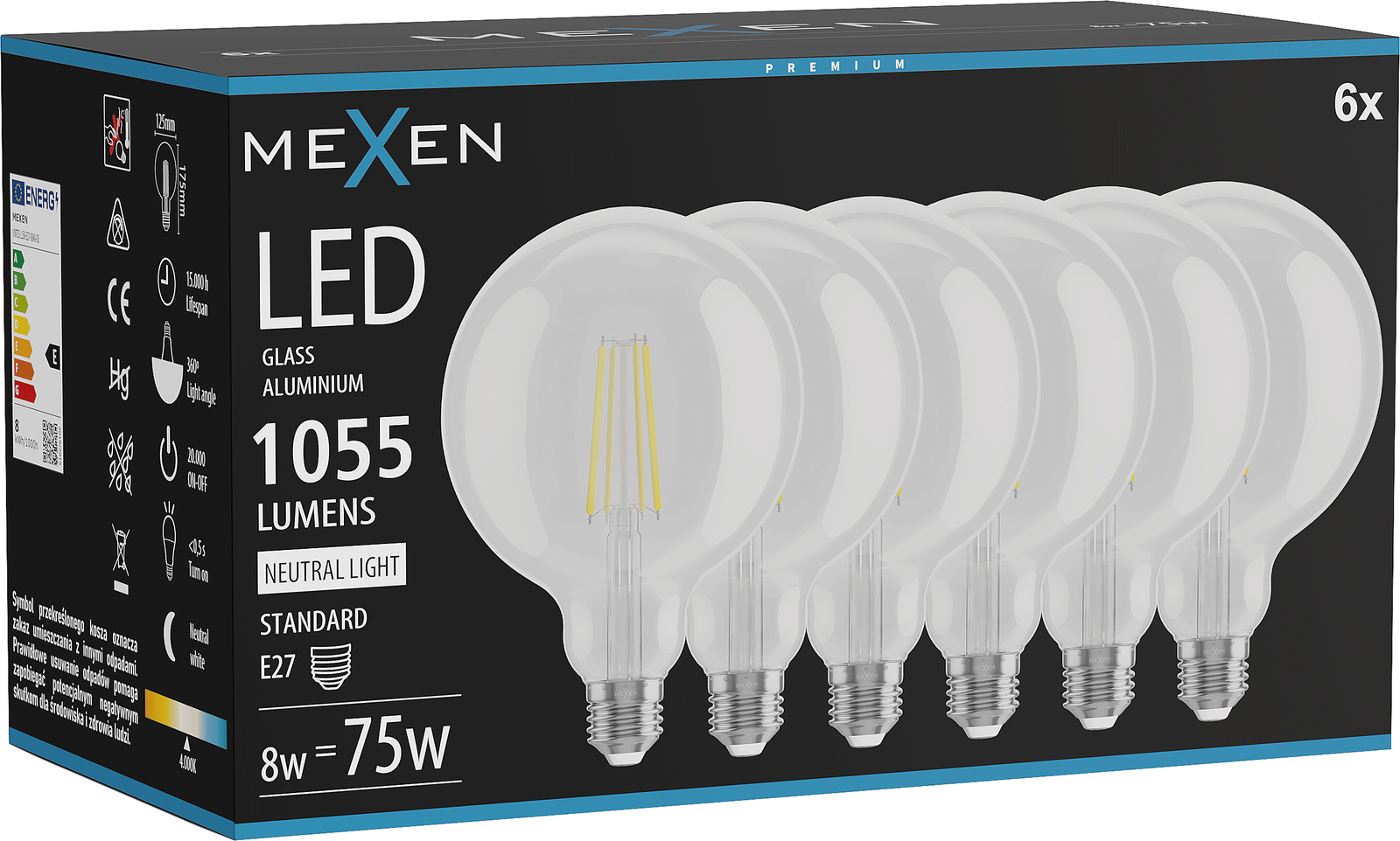 Mexen Vintis 6x LED filament bulb E27, G125, 8W, Neutral - 4000K, 1055 lm, clear - L158-E27-0840-00x06
