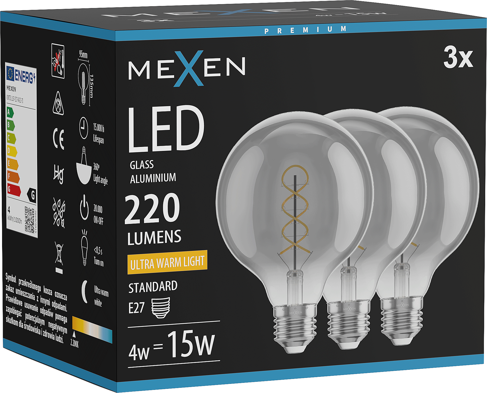Mexen Vintis 3x Filament Spiral LED Bulb E27, G95, 4W, Warm - 2200K, 220 lm, smoke - L167-E27-0422-70x03