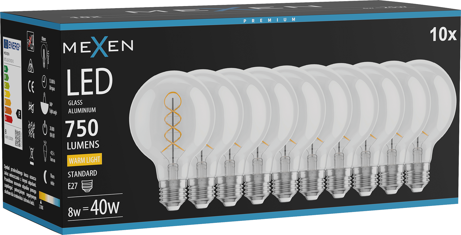 Mexen Vintis 10x LED Filament Spiral Bulb E27, G80, 8W, Warm - 2700K, 750 lm, clear - L165-E27-0827-00x10