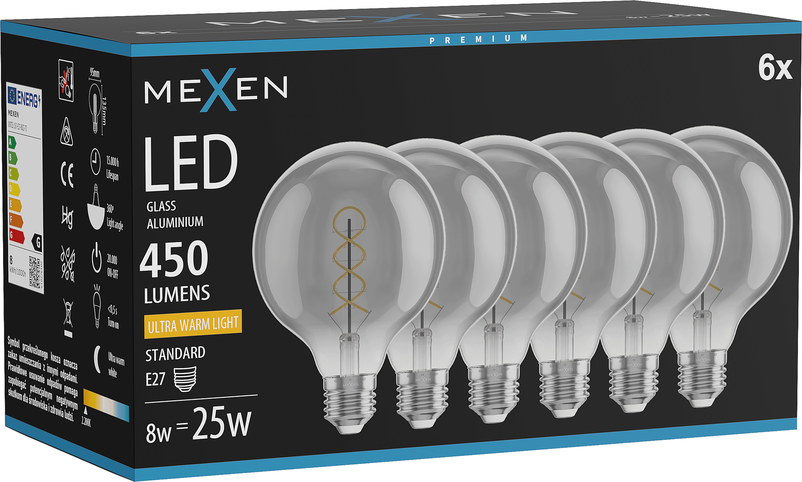 Mexen Vintis 6x LED Filament Spiral Bulb E27, G95, 8W, Warm - 2200K, 450 lm, Smoke - L167-E27-0822-70x06