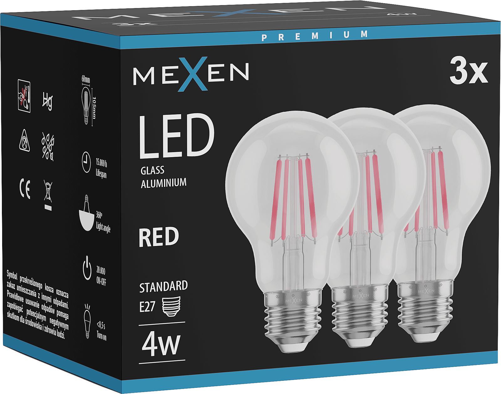Mexen Vintis 3x LED Filament Bulb E27, A60, 4W, 55 lm, red - L150-E27-04XX-45x03