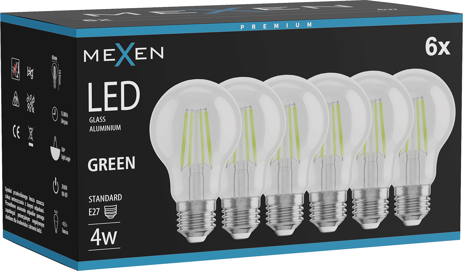 Mexen Vintis 6x LED Filament Bulb E27, A60, 4W, 55 lm, green - L150-E27-04XX-46x06