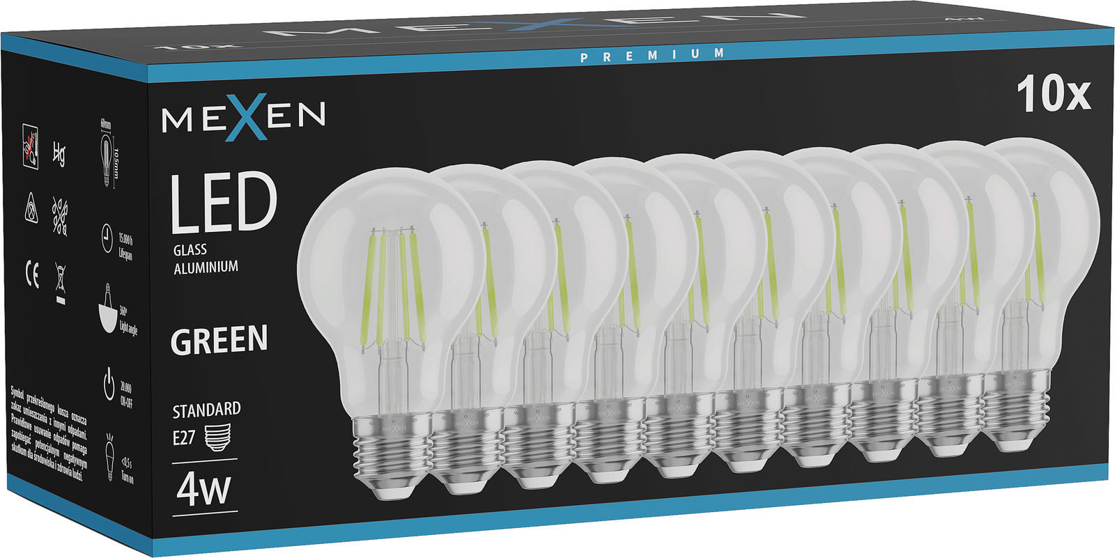 Mexen Vintis 10x LED Filament Bulb E27, A60, 4W, 55 lm, green - L150-E27-04XX-46x10