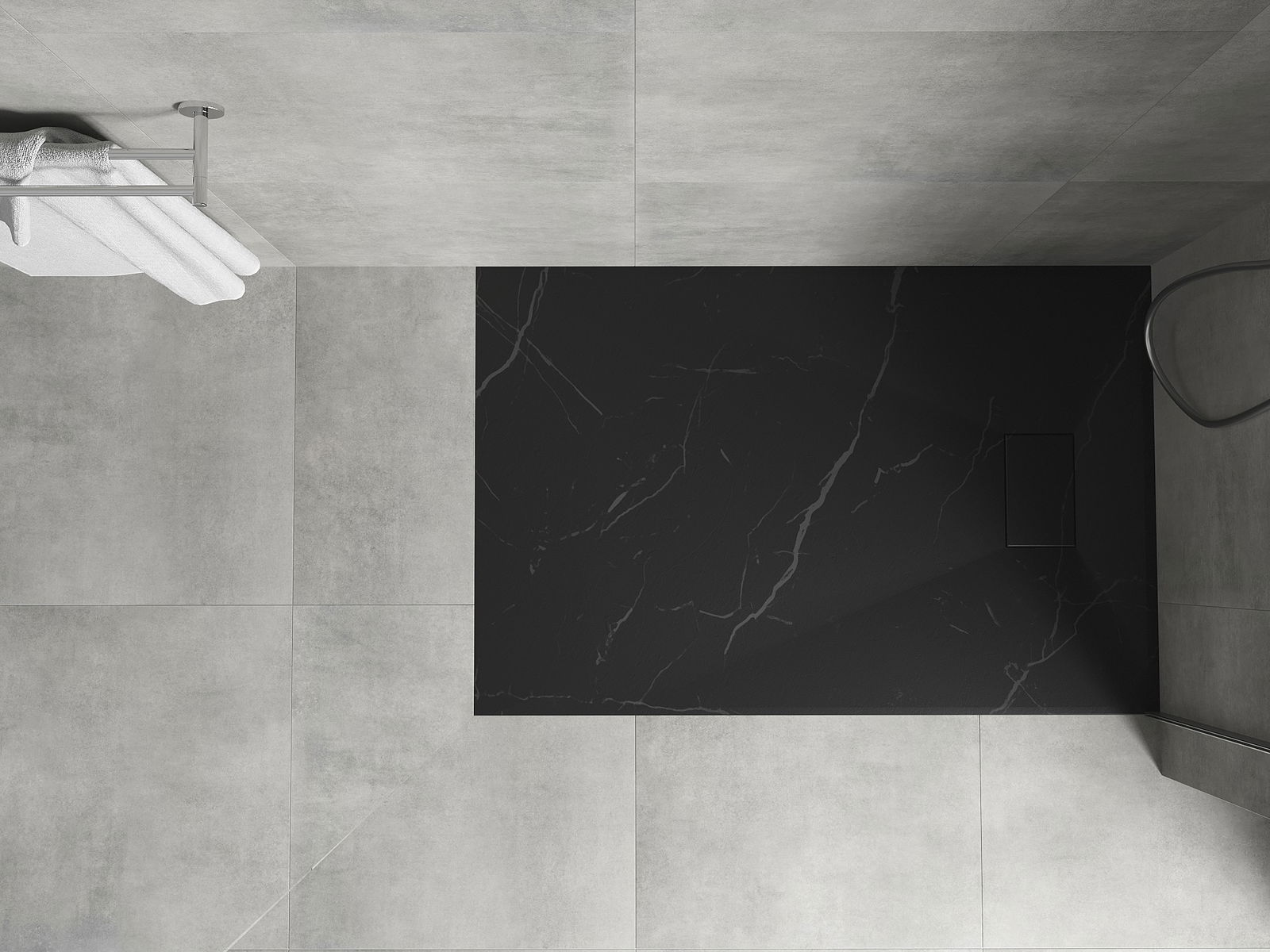 Mexen Hugo is a modern rectangular shower tray with dimensions of 100x80 cm, made of durable SMC material that is resistant to deformation and impacts. Its elegant black color and stone structure add style to any bathroom. The model is ultra-thin, which facilitates installation in the floor or on the floor. The set includes a siphon with a drain diameter of 90 mm, which ensures convenience of use. Additionally, there is a possibility to trim the shower tray, which increases its functionality.